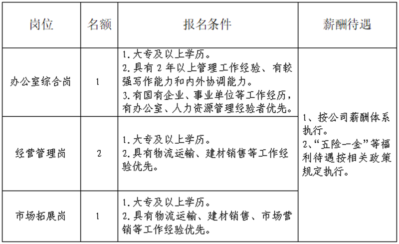 雅安交建集團運通貿易有限公司是雅安市交通建設(集團)有限責任公司下屬子公司。主要從事普通貨運、建材銷售、供應鏈管理、貨運代理、貨運信息咨詢服務、倉儲配送服務等工作,F(xiàn)根據(jù)公司業(yè)務發(fā)展需要,決定招聘4名工作人員,現(xiàn)將有關事項公告如下: