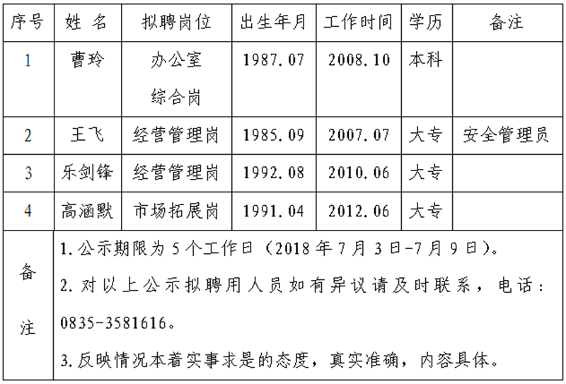 通過公開報(bào)名、資格審查、面試等程序,經(jīng)公司研究確定以下4名擬聘用人員,現(xiàn)公示名單如下: