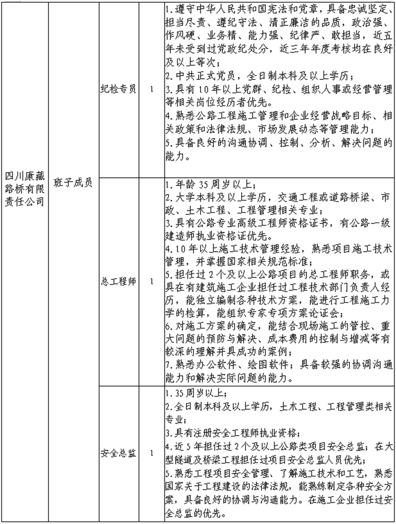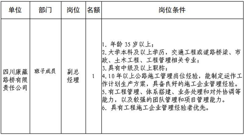 根據(jù)發(fā)展需要,決定面向社會公開招聘雅安市交通建設(shè)(集團)有限責任公司(以下簡稱“雅安交建集團”)所屬子公司班子成員4名,現(xiàn)將有關(guān)事項公告如下: