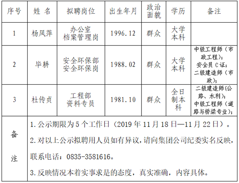 通過公開報(bào)名、資格審查、面試等程序,經(jīng)雅安交建集團(tuán)資產(chǎn)經(jīng)營管理有限公司研究擇優(yōu)確定以下3名擬聘用人員,現(xiàn)公示名單如下:
