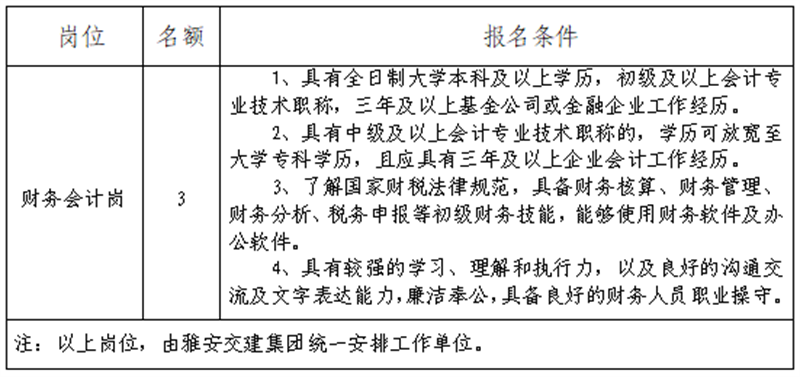 根據(jù)發(fā)展需要,決定面向社會(huì)公開招聘雅安市交通建設(shè)(集團(tuán))有限責(zé)任公司(以下簡(jiǎn)稱“雅安交建集團(tuán)”)所屬子公司財(cái)務(wù)工作人員3名,現(xiàn)將有關(guān)事項(xiàng)公告如下: