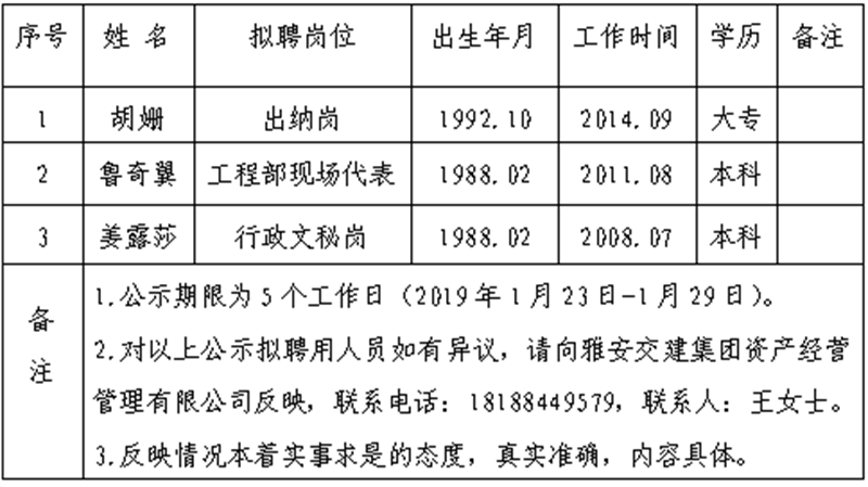 雅安交建集團(tuán)資產(chǎn)經(jīng)營管理有限公司擬聘用人員公示