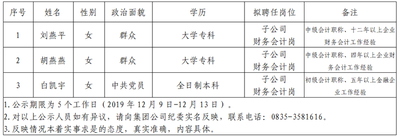 根據(jù)雅安市交通建設(shè)(集團(tuán))有限責(zé)任公司招聘公告,經(jīng)公開報名、資格初審、筆試、面試、等環(huán)節(jié),現(xiàn)將以下3名擬聘用人員予以公示: