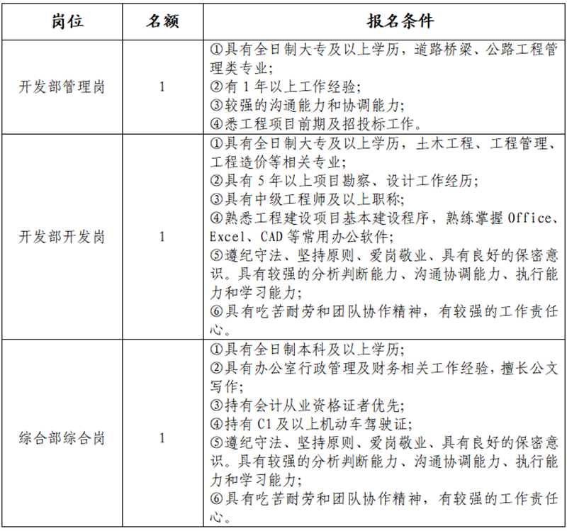 雅安交建集團(tuán)大興交通開發(fā)有限公司是雅安市重點(diǎn)國有企業(yè)雅安市交建集團(tuán)下屬子公司,主要從事交通基礎(chǔ)設(shè)施及服務(wù)設(shè)施投資、建設(shè)開發(fā);土地整理;房地產(chǎn)開發(fā);建筑材料生產(chǎn)、銷售;旅游開發(fā)等業(yè)務(wù)。根據(jù)公司發(fā)展需要,決定面向社會公開招聘3名工作人員,現(xiàn)將有關(guān)事項(xiàng)公告如下: