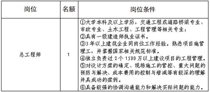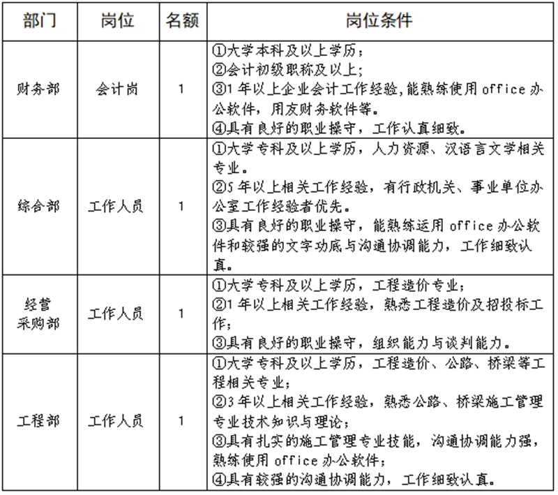 雅安交建集團路橋有限責(zé)任公司是雅安市交通建設(shè)(集團)有限責(zé)任公司下屬子公司,主要從事道路、橋梁修建。現(xiàn)根據(jù)公司業(yè)務(wù)發(fā)展需要,擬向社會公開招聘總工程師1名,工作人員4名,現(xiàn)將有關(guān)事項公告如下: