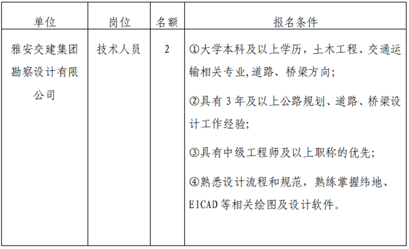 根據(jù)發(fā)展需要,決定面向社會公開招聘雅安市交通建設(集團)有限責任公司(以下簡稱“雅安交建集團”)所屬子公司工作人員2名,現(xiàn)將有關事項公告如下: