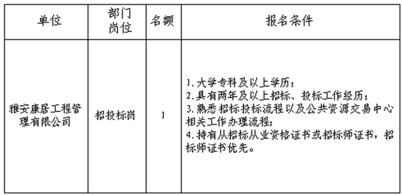 根據(jù)發(fā)展需要,決定面向社會(huì)公開招聘雅安市交通建設(shè)(集團(tuán))有限責(zé)任公司(以下簡(jiǎn)稱“雅安交建集團(tuán)”)所屬子公司工作人員1名,現(xiàn)將有關(guān)事項(xiàng)公告如下: