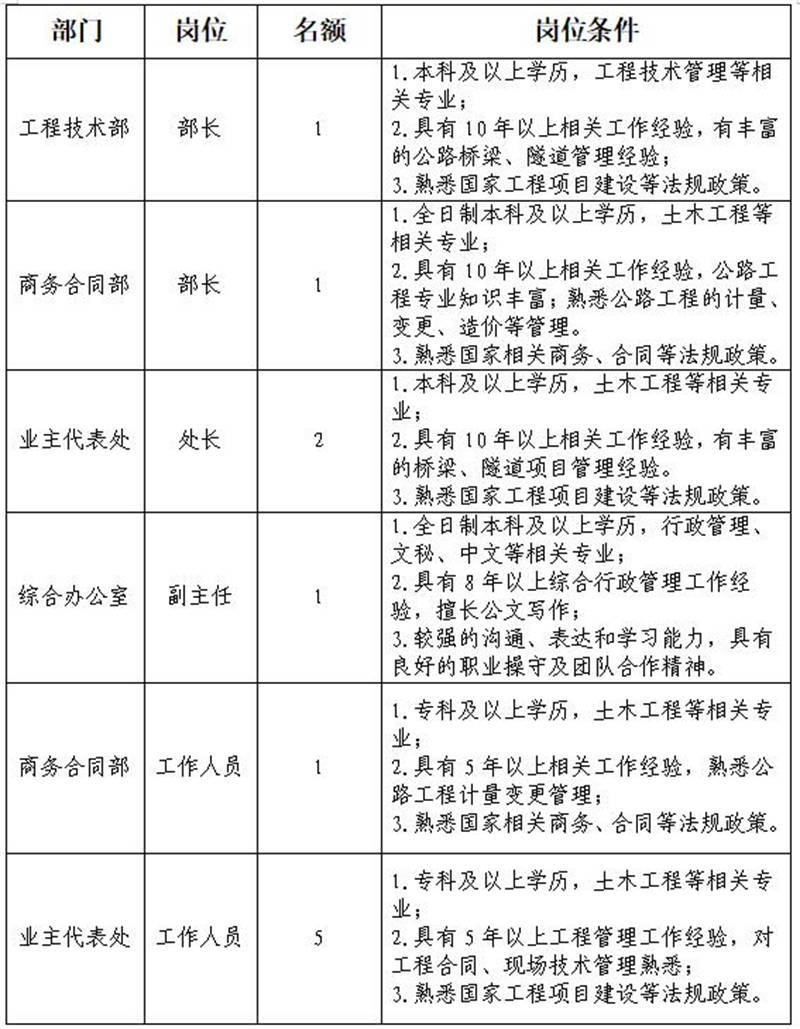 根據(jù)發(fā)展需要,決定面向社會公開招聘雅安市交通建設(shè)(集團(tuán))有限責(zé)任公司(以下簡稱“雅安交建集團(tuán)”)所屬子公司管理人員及工作人員共計(jì)11名,現(xiàn)將有關(guān)事項(xiàng)公告如下: