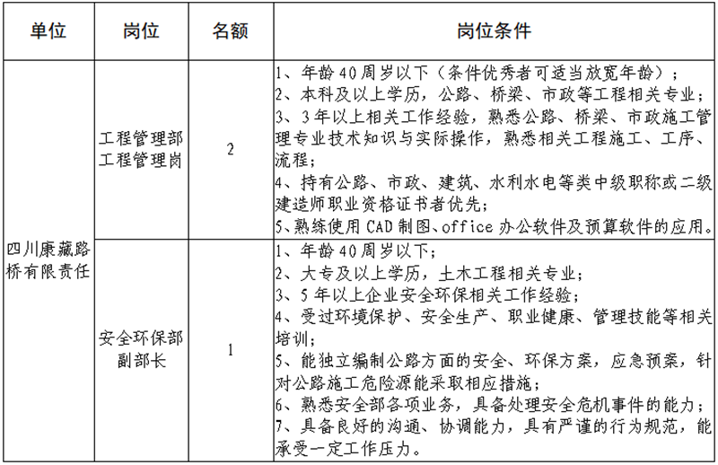 根據(jù)發(fā)展需要,決定面向社會(huì)公開招聘雅安市交通建設(shè)(集團(tuán))有限責(zé)任公司(以下簡(jiǎn)稱“雅安交建集團(tuán)”)所屬子公司相關(guān)人員3名,現(xiàn)將有關(guān)事項(xiàng)公告如下: