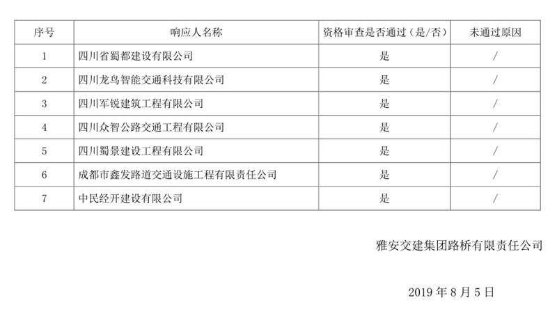 雅安交建集團路橋有限責(zé)任公司公路安全設(shè)施施工企業(yè)入庫比選結(jié)果