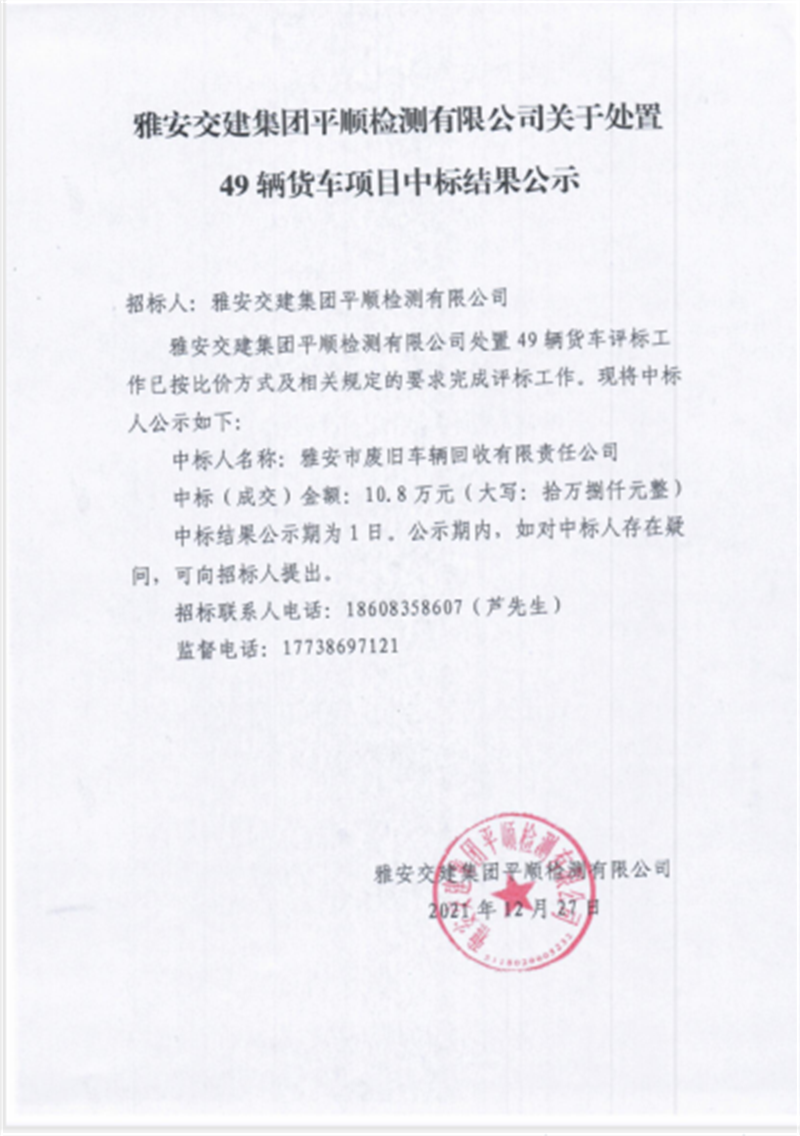 雅安交建集團(tuán)平順檢測(cè)公司關(guān)于處置49輛貨車項(xiàng)目中標(biāo)結(jié)果公示