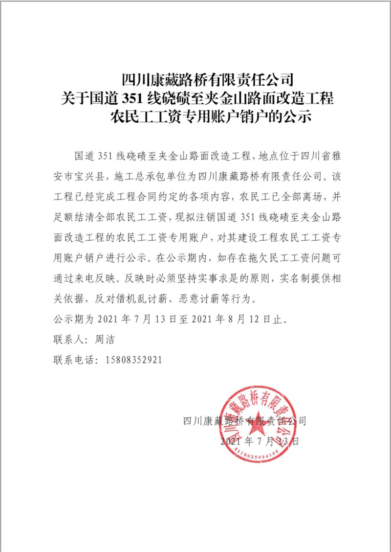 關(guān)于國道351線磽磧至夾金山路面改造工程農(nóng)民工工資專用賬戶銷戶的公示