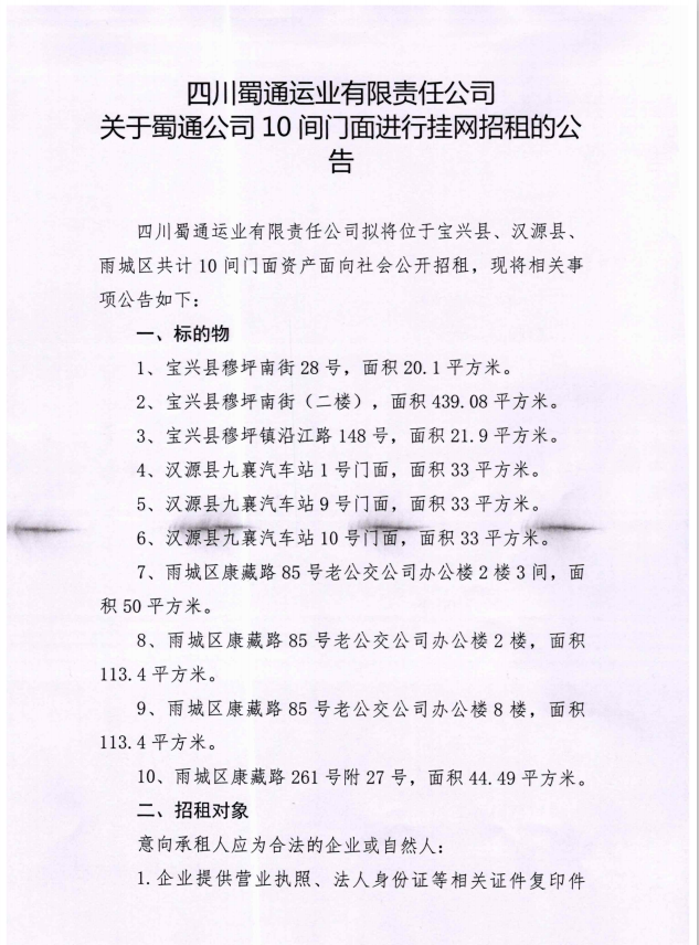 關(guān)于蜀通公司10間門面進行掛網(wǎng)招租的公告