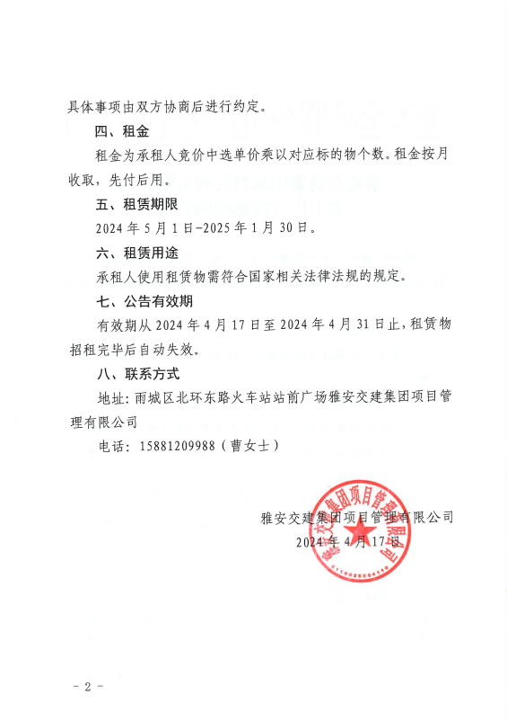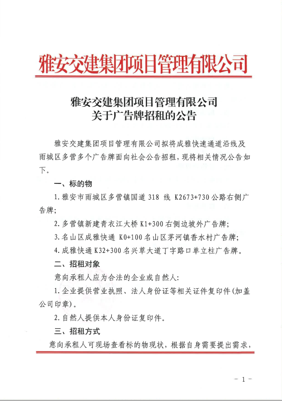 雅安交建集團項目管理有限公司關于廣告牌招租的公告
