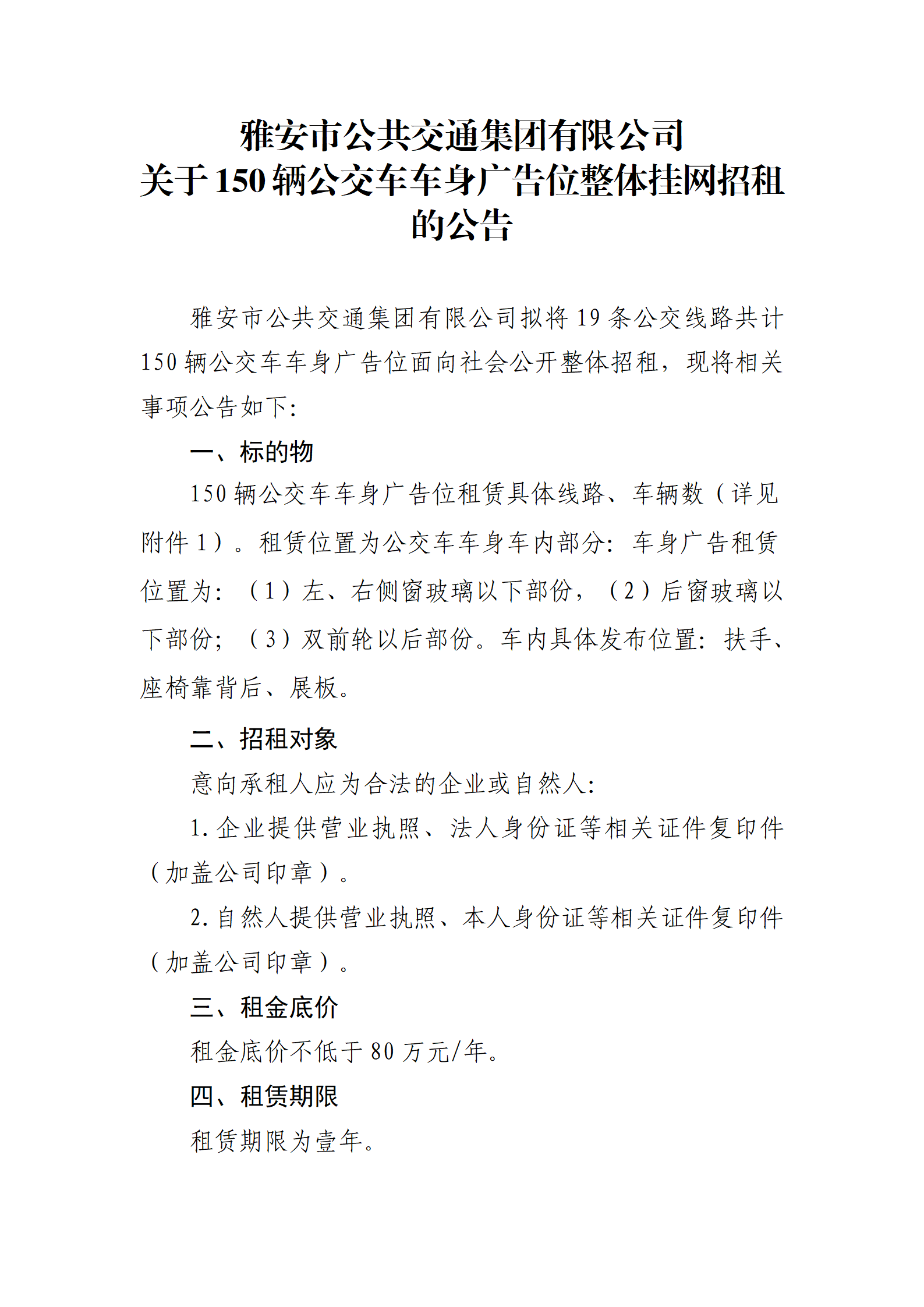雅安市公共交通集團(tuán)有限公司 關(guān)于150輛公交車車身廣告位整體掛網(wǎng)招租的公告
