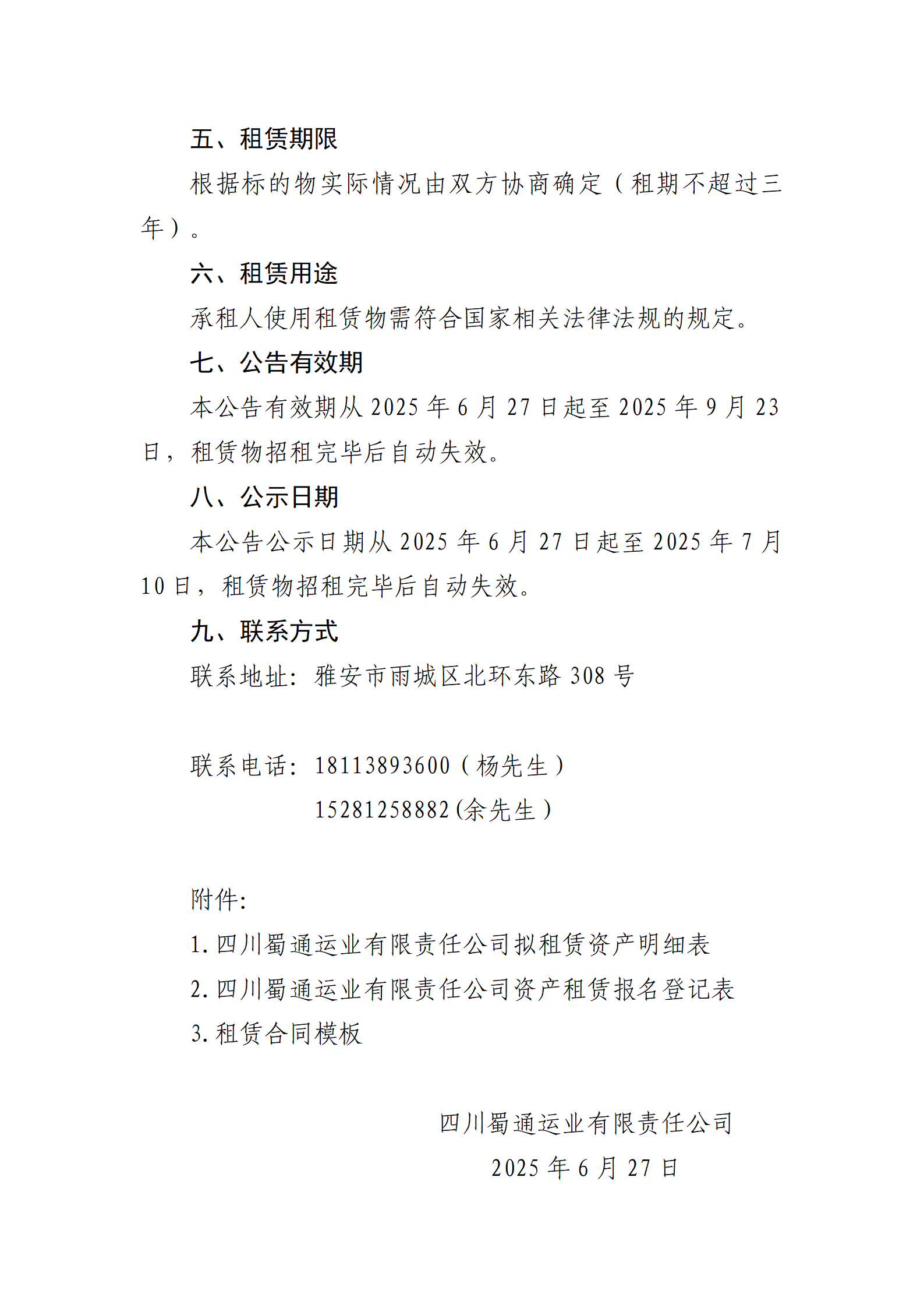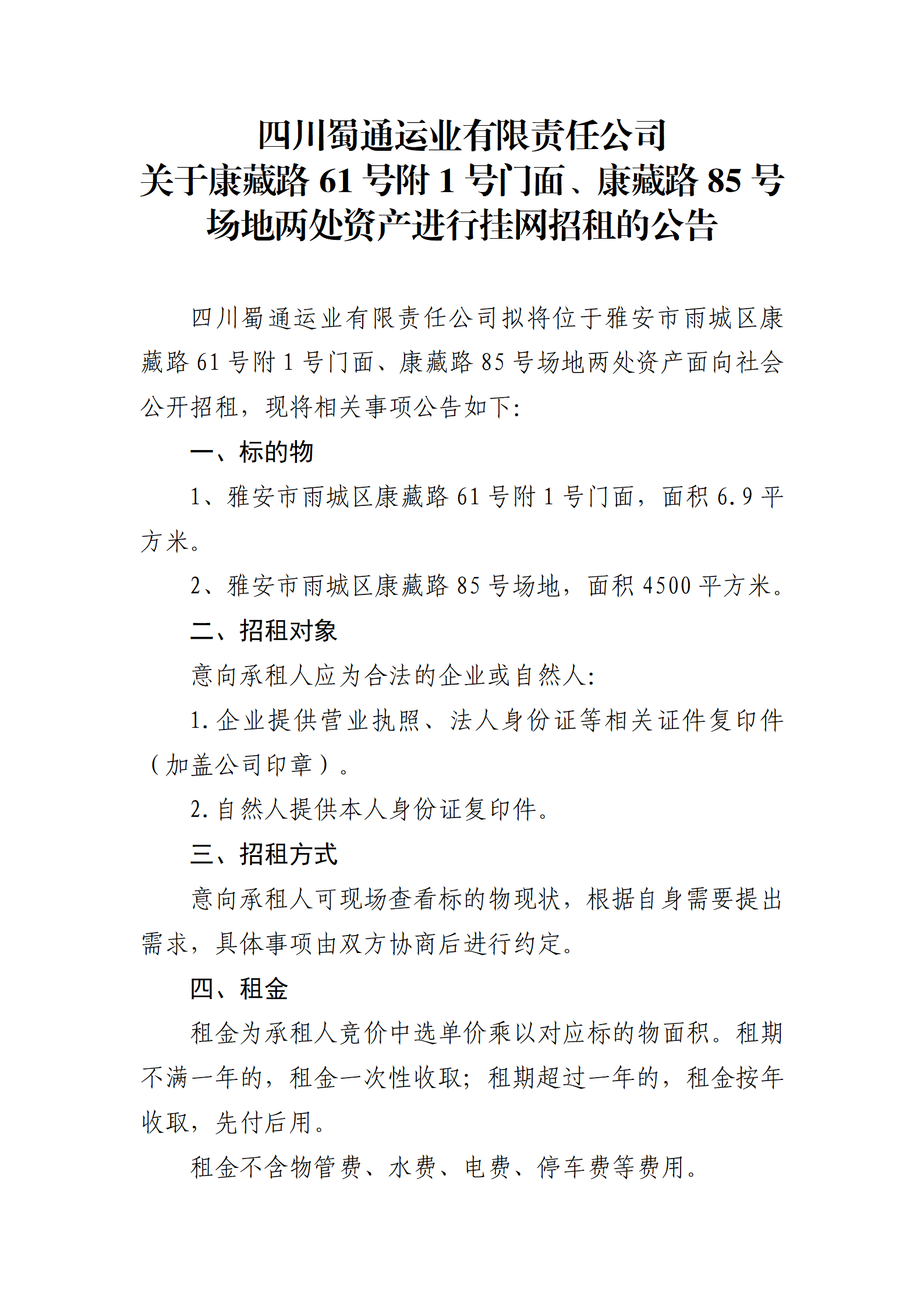 四川蜀通運業(yè)有限責任公司 關(guān)于康藏路61號附1號門面、康藏路85號場地兩處資產(chǎn)進行掛網(wǎng)招租的公告
