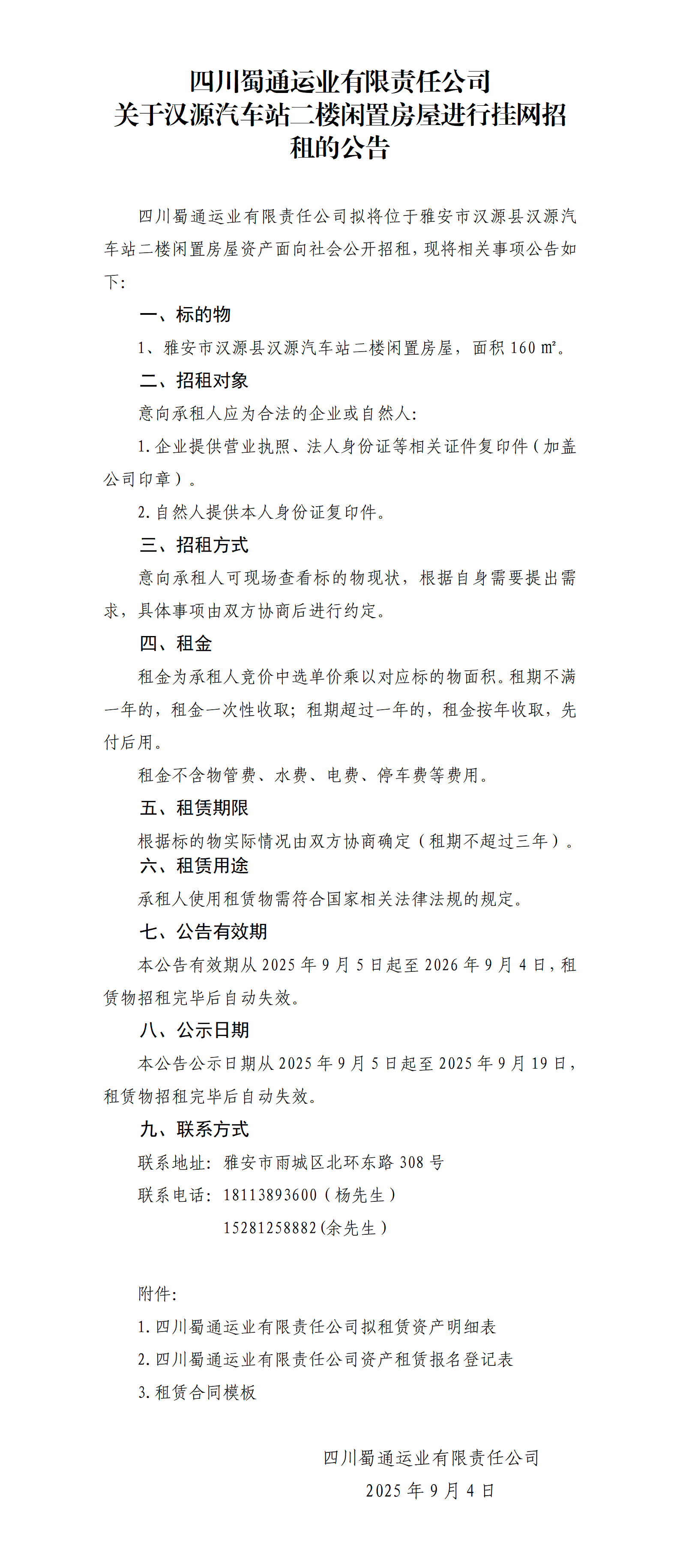 四川蜀通運業(yè)有限責(zé)任公司 關(guān)于漢源汽車站二樓閑置房屋進(jìn)行掛網(wǎng)招租的公告