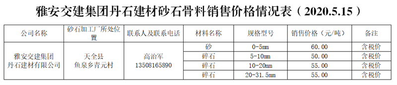 丹石建材有限公司。丹石公司是天全縣人民政府指定天全縣二郎山文化旅游投資開發(fā)有限公司與雅安市交通建設(shè)(集團(tuán))有限責(zé)任公司共同組建的合資公司。公司通過公開競拍取得儲量2000萬方的魚泉獅子山灰?guī)r礦,并在天全縣魚泉鄉(xiāng)青元村建立砂石骨料生產(chǎn)線,設(shè)計(jì)年產(chǎn)能200萬噸。目前,礦山開采項(xiàng)目處于在建階段,砂石生產(chǎn)加工廠區(qū)處于設(shè)備調(diào)試和產(chǎn)能驗(yàn)收階段。生產(chǎn)廠區(qū)距雨城區(qū)中心城區(qū)約50公里。