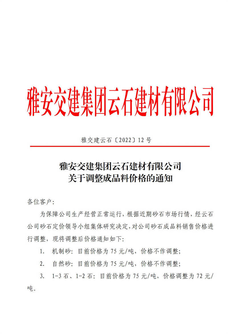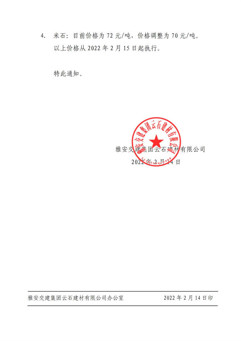 ÑŰ²½»½¨¼¯ˆF(tu¨¢n)ÔÆÊ¯½¨²ÄÓÐÏÞ¹«Ë¾êP(gu¨¡n)ÓÚÕ{(di¨¤o)Õû³ÉÆ·Áσr(ji¨¤)¸ñµÄ֪ͨ£¨2022-2-14£©