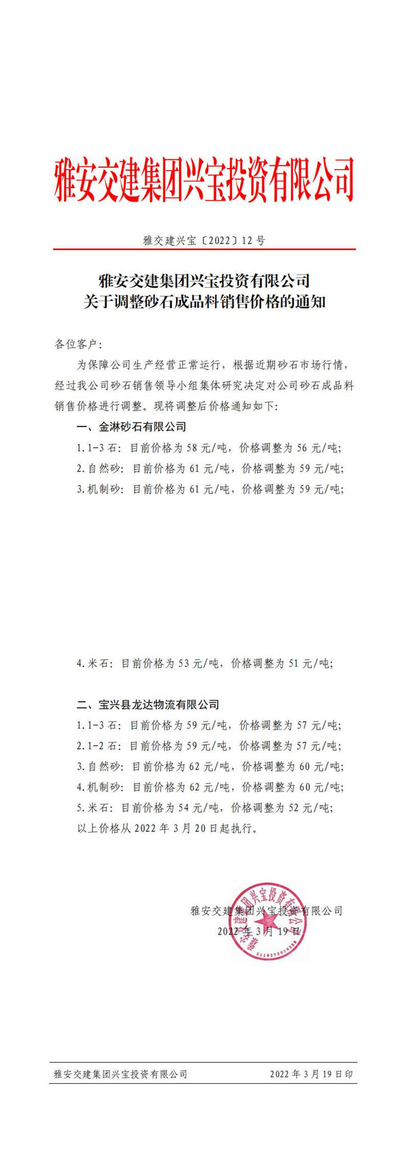 ÑŰ²½»½¨ÅdŒš¹«Ë¾êPÓÚÕ{Õûɰʯ³ÉÆ·ÁÏäNÊÛƒr¸ñµÄ֪ͨ£¨2022-3-1£©