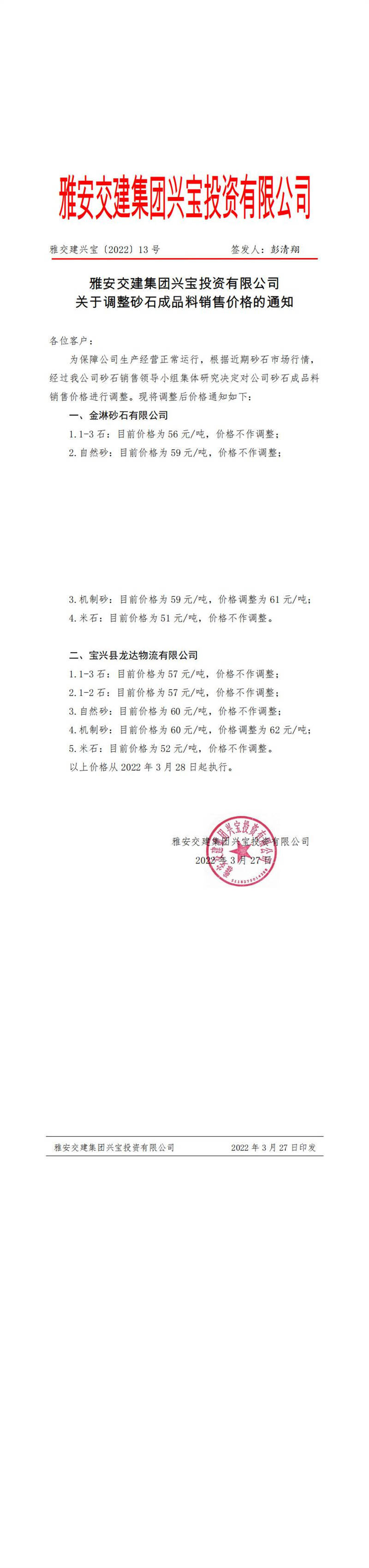 雅交建興寶〔2022〕13號 關(guān)于調(diào)整砂石成品料銷售價(jià)格的通知-3月27日