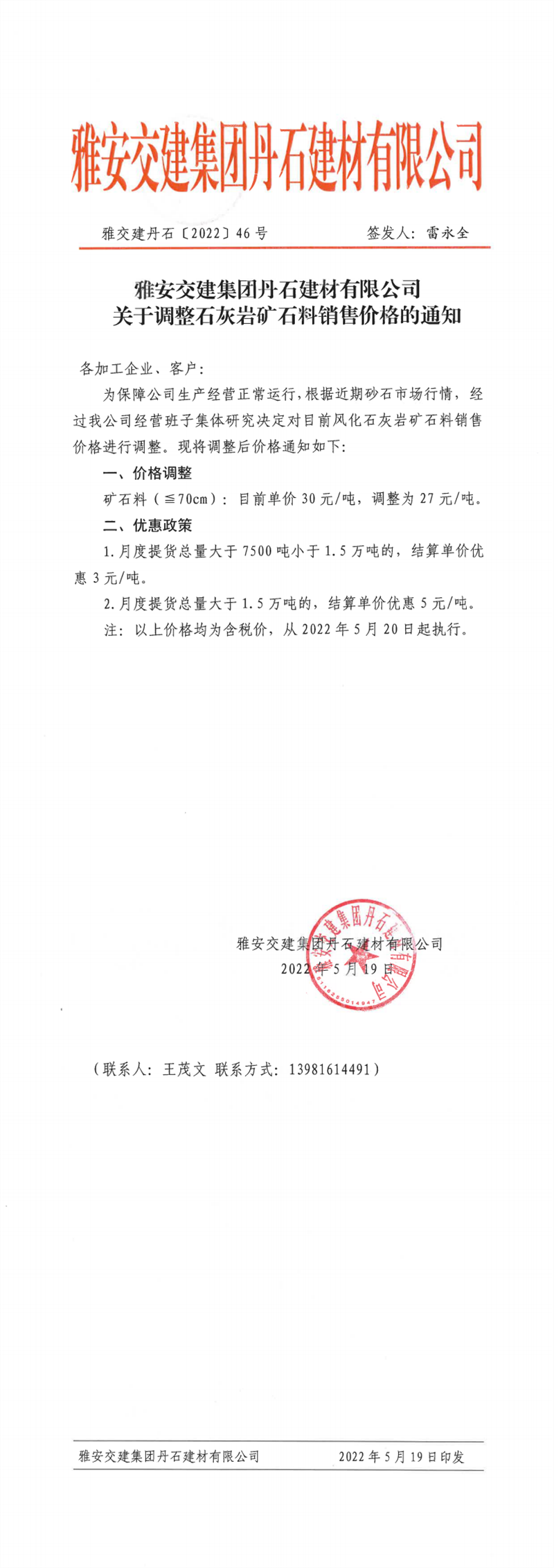 雅安交建集團(tuán)丹石公司關(guān)于調(diào)整石灰?guī)r礦石料價(jià)格的通知-2022-5-19