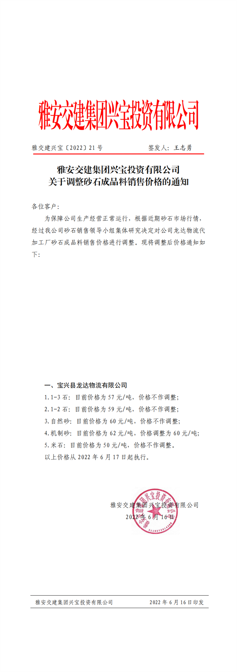 ÑŰ²½»½¨¼¯ˆF(tu¨¢n)ÅdŒšÍ¶ÙYÓÐÏÞ¹«Ë¾ êP(gu¨¡n)ÓÚÕ{(di¨¤o)Õûɰʯ³ÉÆ·ÁÏäNÊÛƒr¸ñµÄ֪ͨ£¨2022.6.16£©