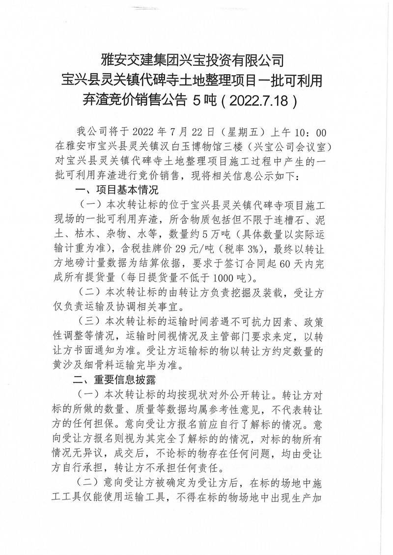 寶興縣靈關(guān)鎮(zhèn)代碑寺土地整理項(xiàng)目一批可利用棄渣競價(jià)銷售公告7.15(5萬噸)