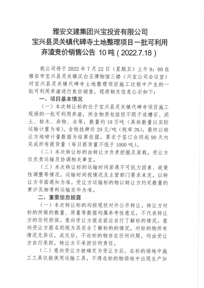 寶興縣靈關(guān)鎮(zhèn)代碑寺土地整理項(xiàng)目一批可利用棄渣競(jìng)價(jià)銷售公告7.18(5萬噸)