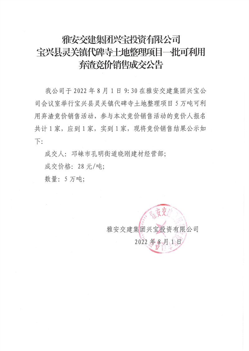 雅安交建集團(tuán)興寶投資有限公司靈關(guān)鎮(zhèn)代碑寺土地整理項(xiàng)目10萬噸可利用棄渣競價銷售成交公告(2022.8.1)