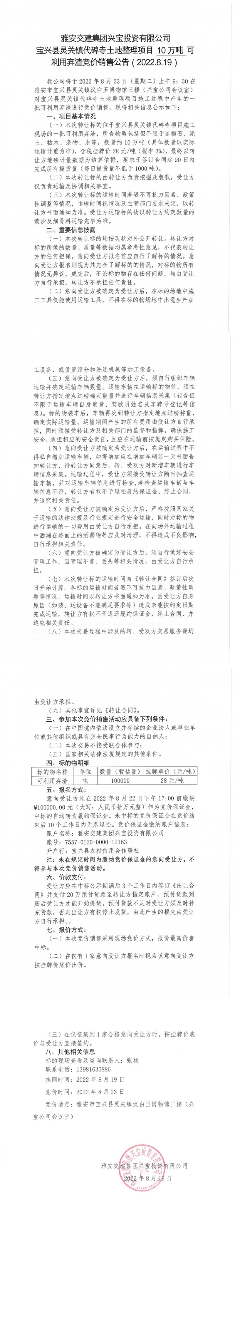 雅安交建集團(tuán)興寶投資有限公司靈關(guān)鎮(zhèn)代碑寺土地整理項(xiàng)目10萬噸可利用棄渣競(jìng)價(jià)銷售公告(2022.8.19)(1)