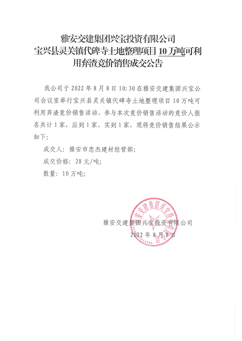 代碑寺土地整理項(xiàng)目10萬噸可利用棄渣競(jìng)價(jià)銷售成交公告