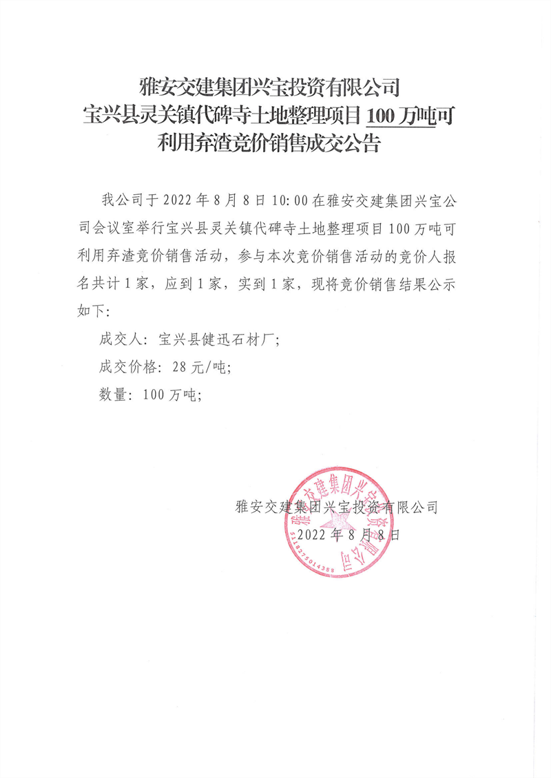 代碑寺土地整理項(xiàng)目10萬噸可利用棄渣競(jìng)價(jià)銷售成交公告