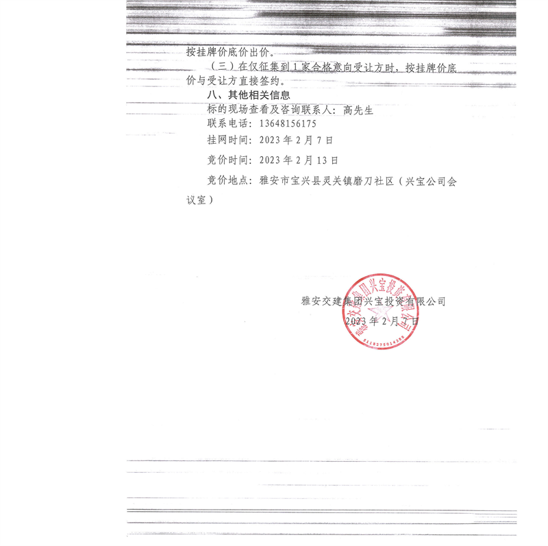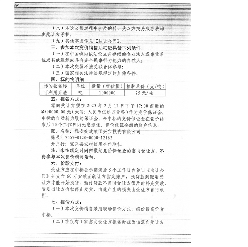 雅安交建集團興寶投資有限公司100萬噸可利用棄渣競價銷售流標公告(2023.2.13)