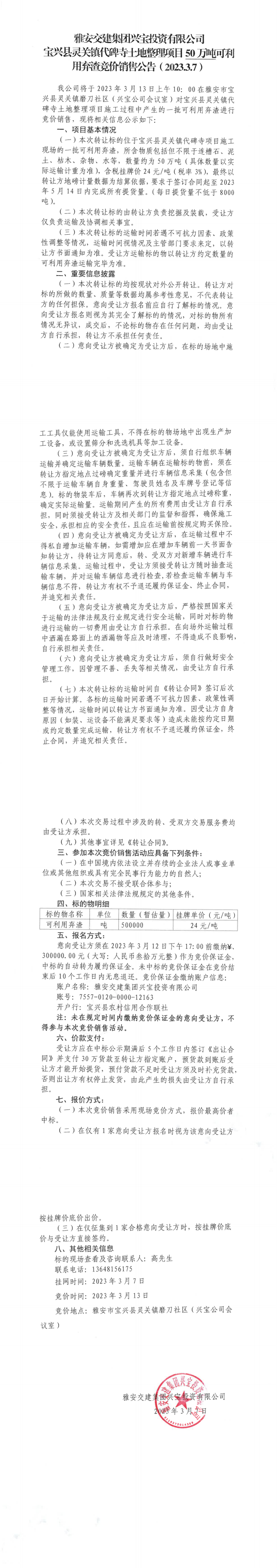 雅安交建集團(tuán)興寶投資有限公司靈關(guān)鎮(zhèn)代碑寺土地整理項(xiàng)目50萬噸可利用棄渣競價(jià)銷售公告(2023.3.7)