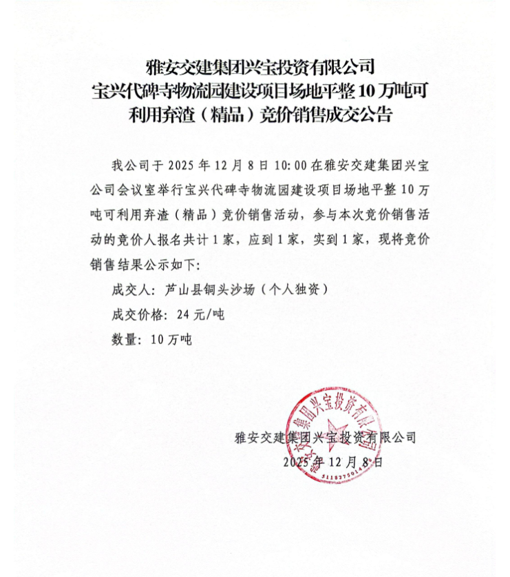 雅安交建集團(tuán)興寶投資有限公司10萬噸可利用棄渣(精品)競(jìng)價(jià)銷售掛網(wǎng)公告(2025.12.04)